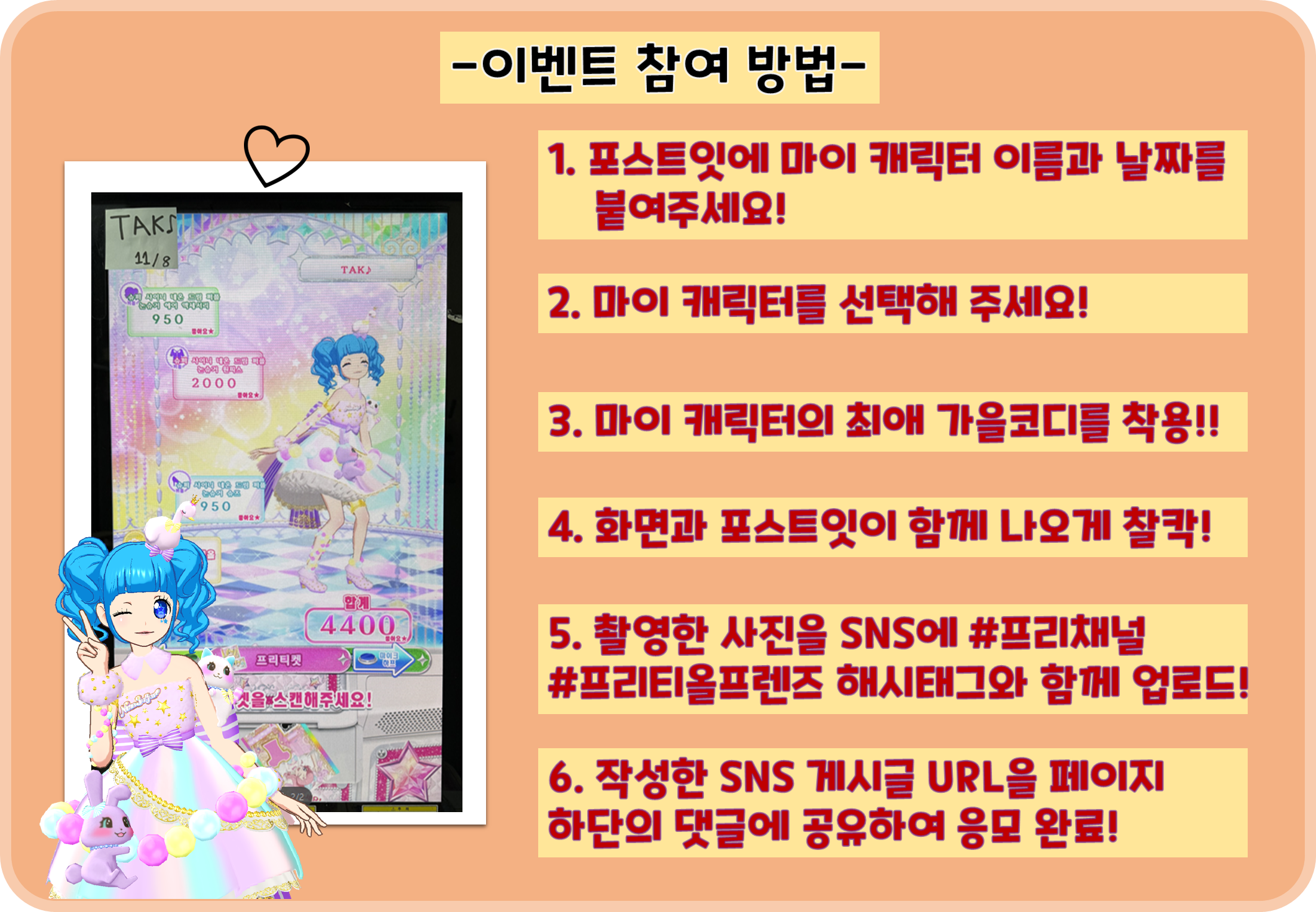 - 코디에 제한은 없으며, 한국 정식 발매된 코디만 응모 가능합니다.(프리파라 코디도 응모 가능)